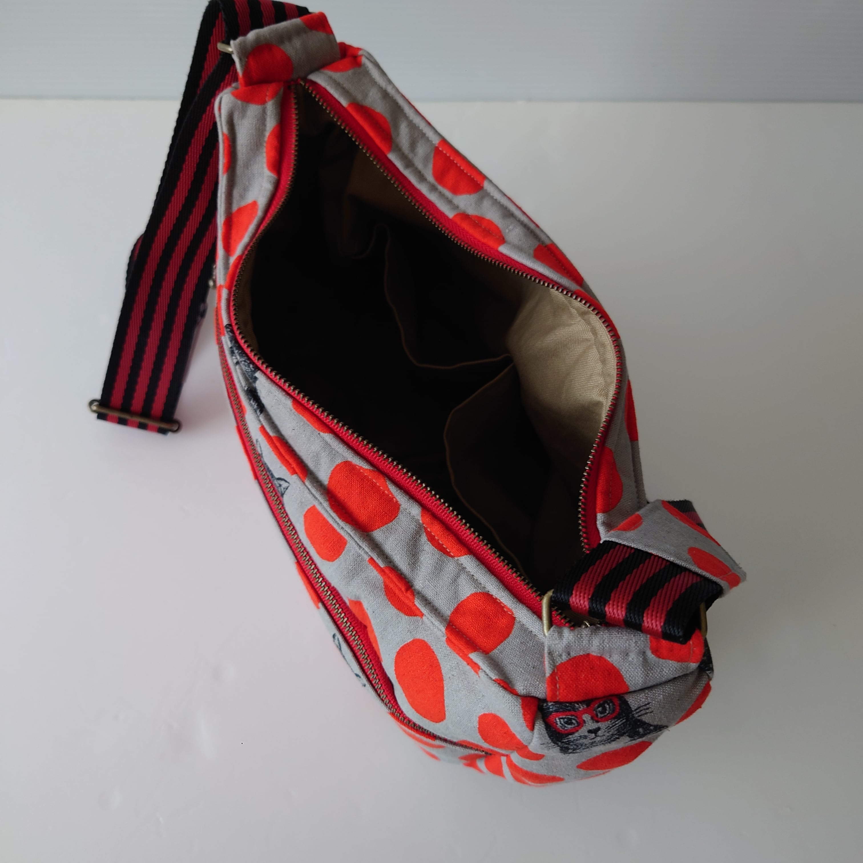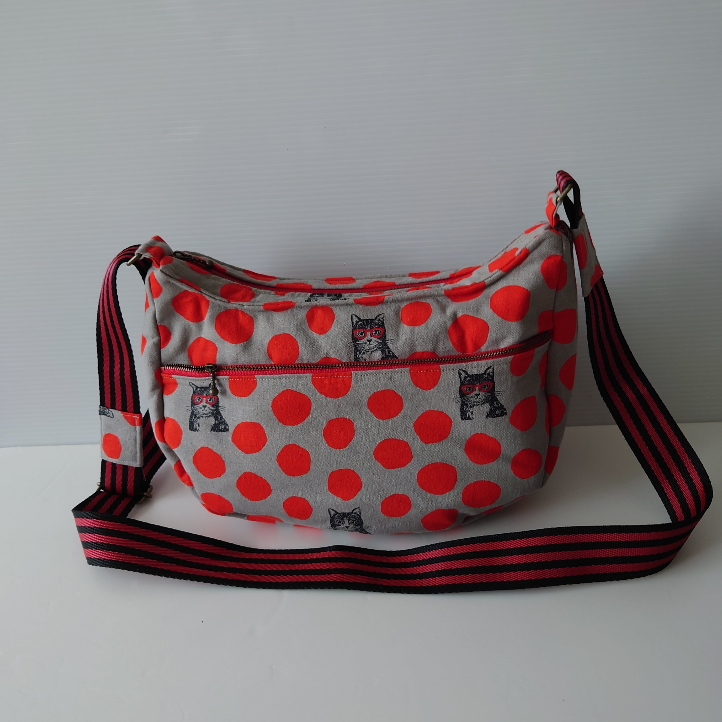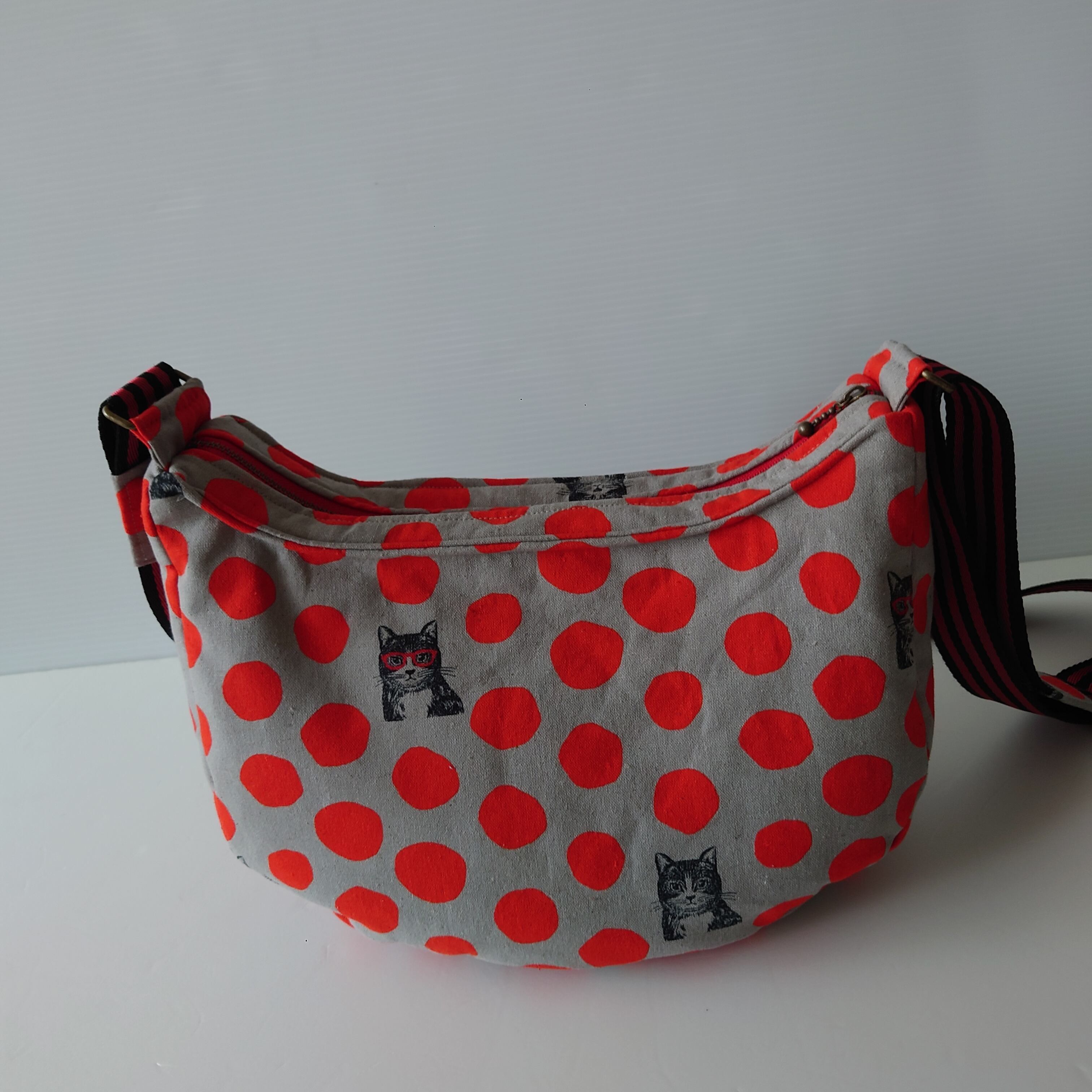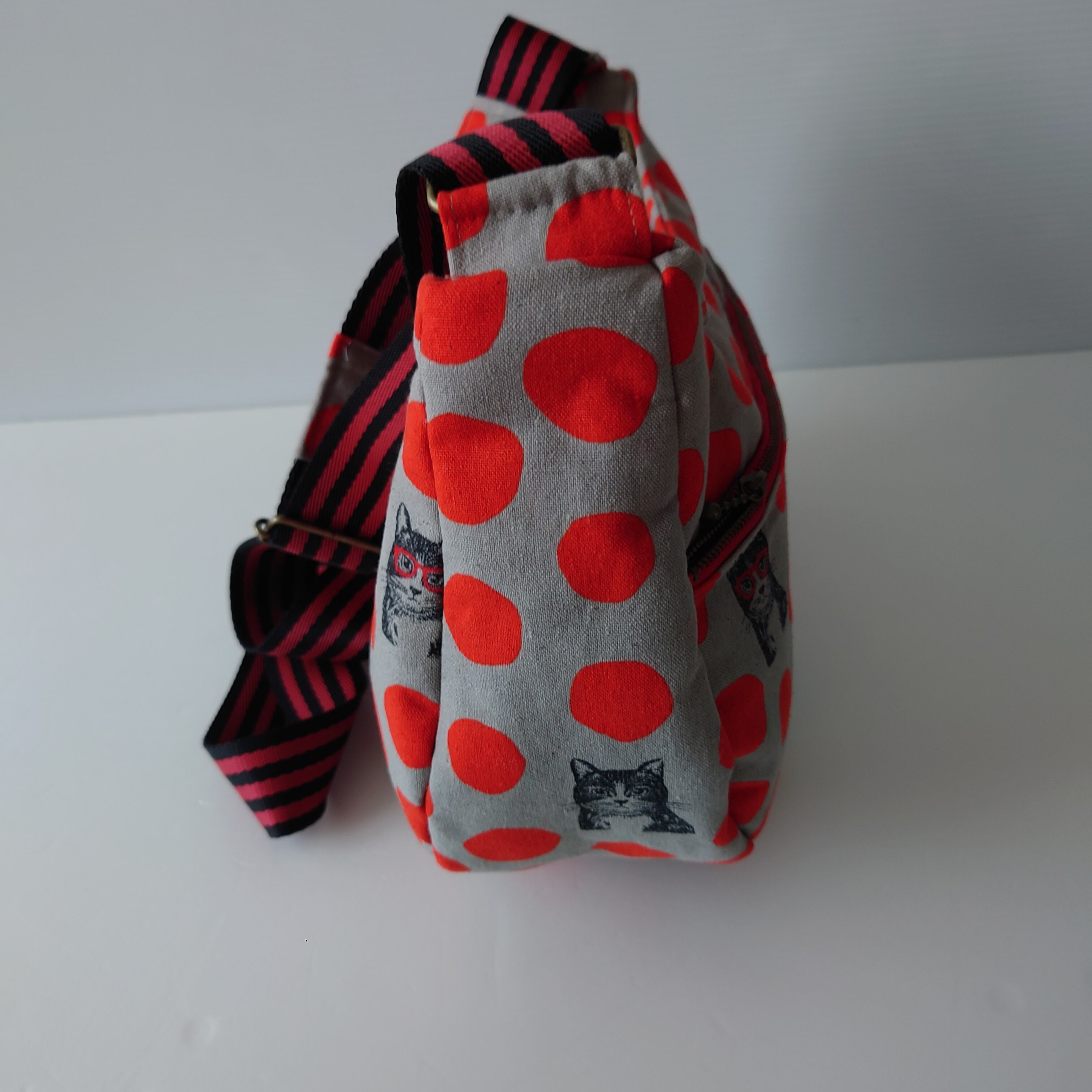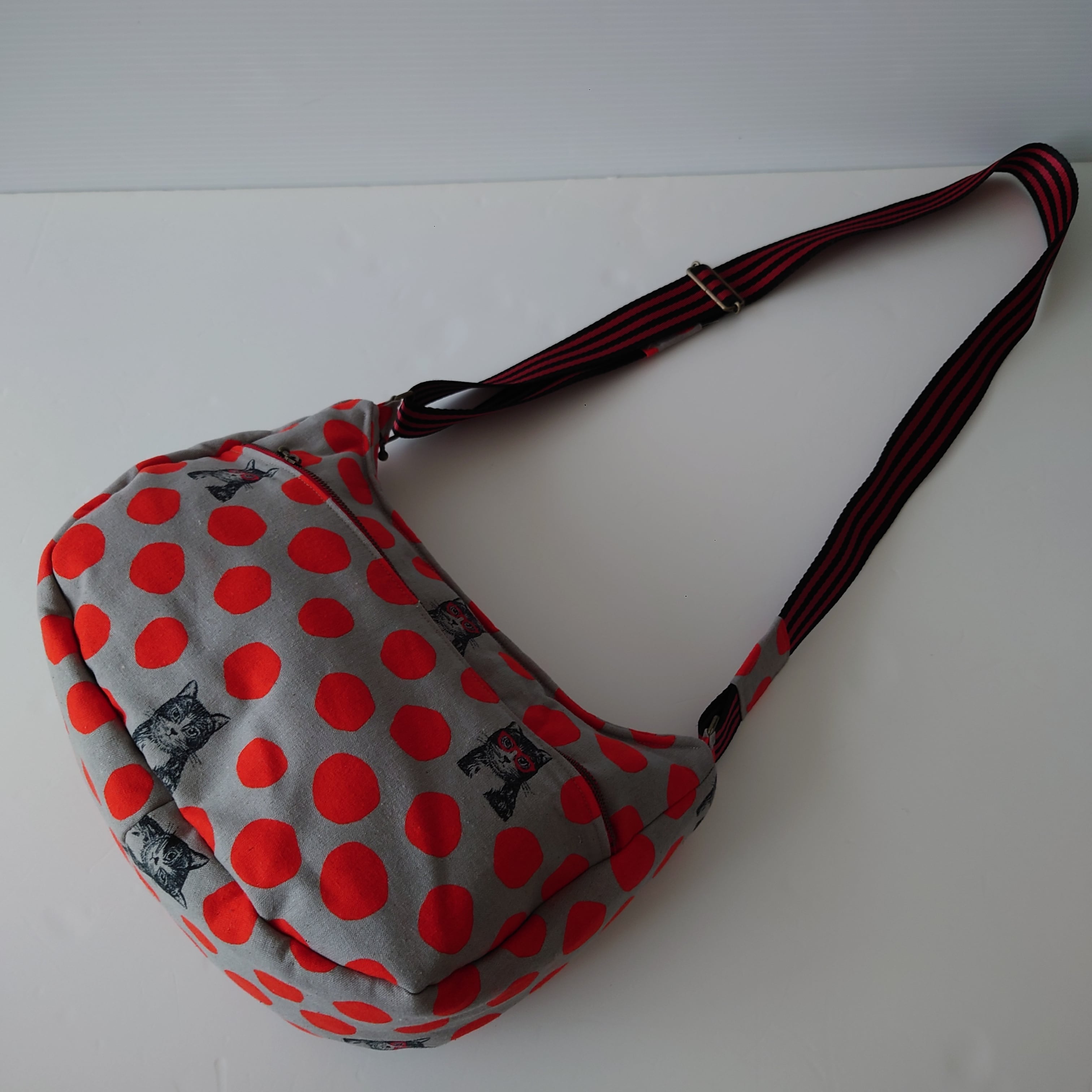 本体にグレーのドットと猫ちゃんの顔がかわいい生地