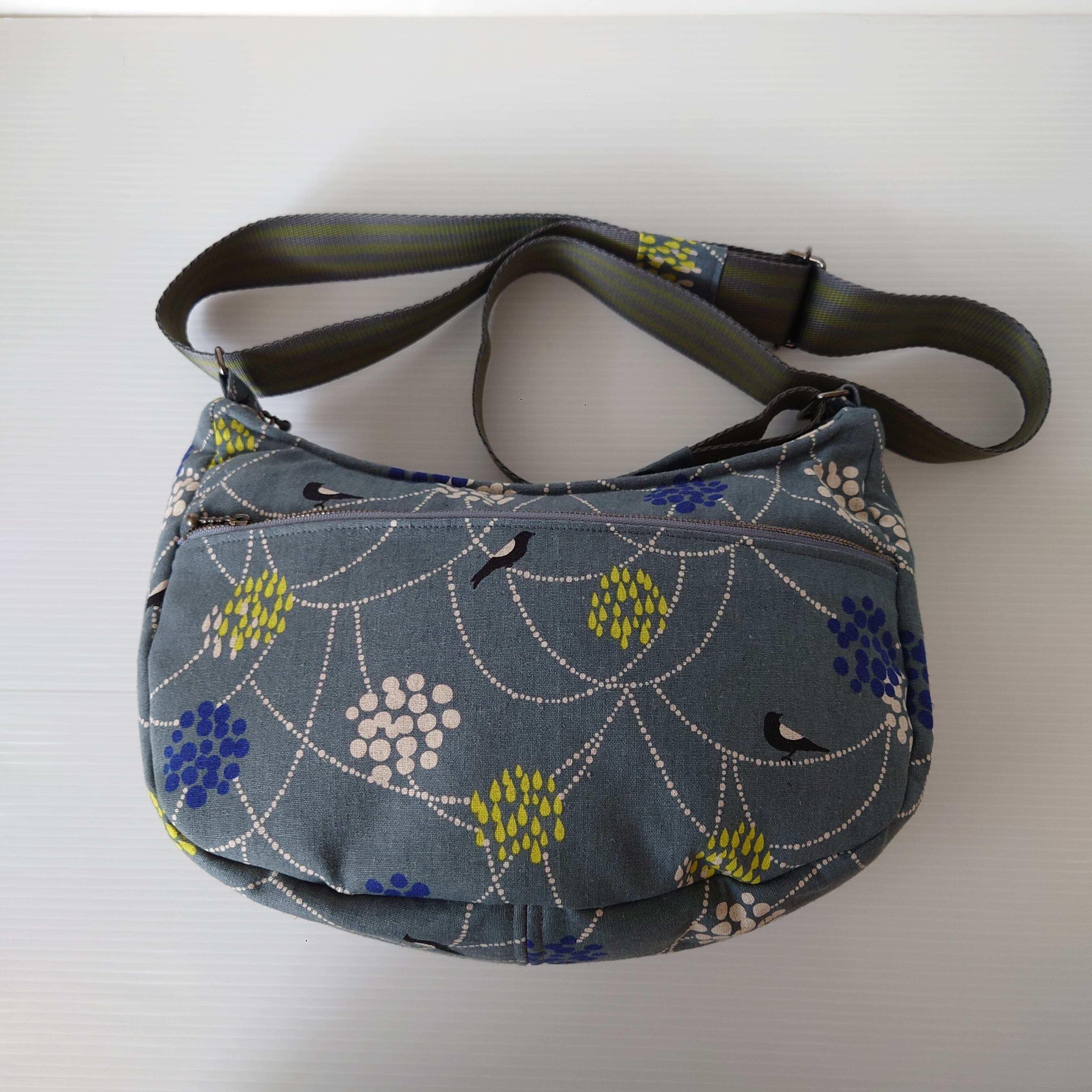 調節付き肩紐、ワンポイントにもなっている、本体と同じ生地をベルト押さえに使っています